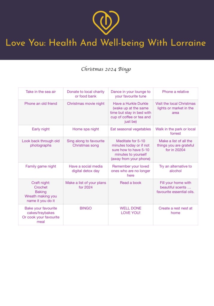 The holiday season can be incredibly hectic, and it should also be a time of joy and celebration. However, it often leads to feelings of stress and habits like overeating and inactivity. To help you and your loved ones find some peace amidst the chaos this Christmas, I’ve put together a delightful well-being bingo game.